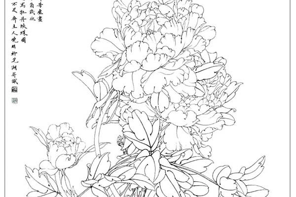 深色花头及正叶用重墨勾勒,反叶及花茎、老干等中墨勾勒,浅色花头淡墨勾勒。本作为体现“丰腴”之美,勾线基本以铁线描为主。唯独叶筋部分为钉头鼠尾描勾勒。蝴蝶基本以游丝描或细铁线描勾勒,触须尖粗根细,略近兰叶描。